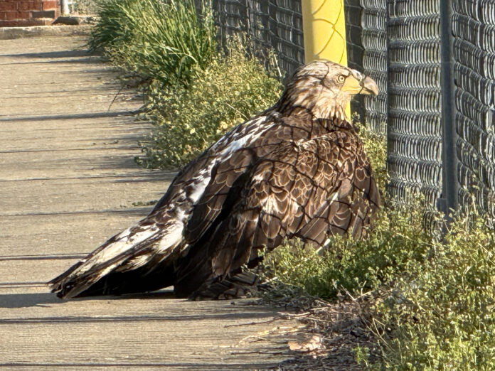 The young female eagle, which has not yet developed the distinctive white head of an adult, apparently made contact with, or caused contact between, power lines, resulting in a short that briefly knocked out power in the area.