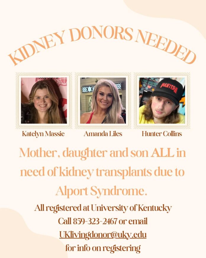 Amanda Liles, her daughter Katelyn Massie, and son Hunter Collins are all registered on the kidney transplant list and are actively searching for living donors.