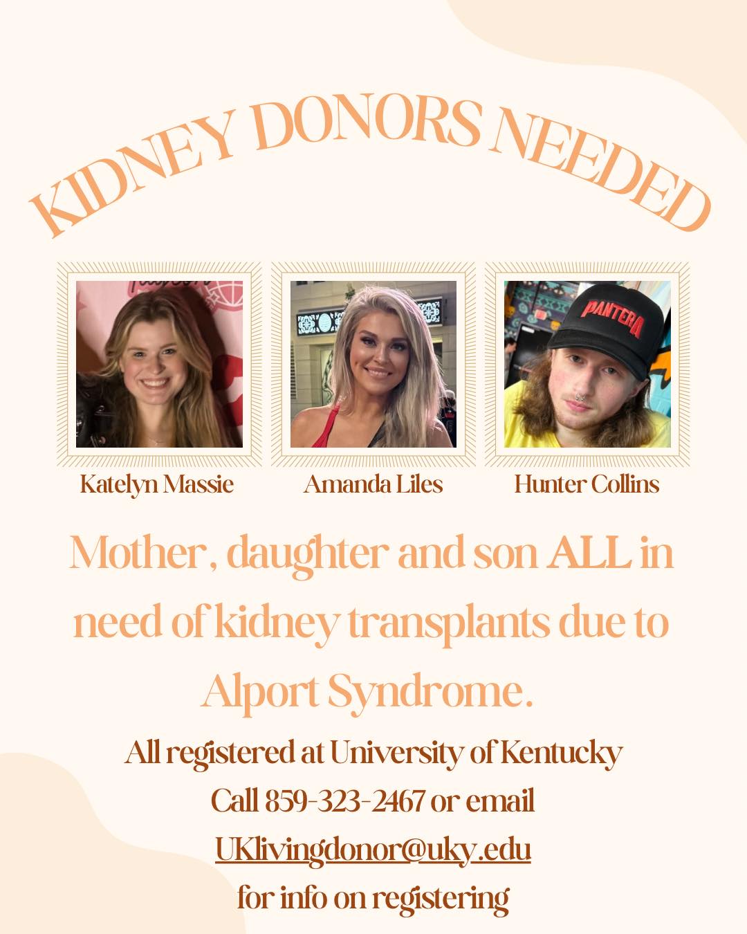 Those unable to donate are encouraged to help by sharing the family’s story, registering as organ donors, and raising awareness about Alport Syndrome and the critical need for organ donation.
